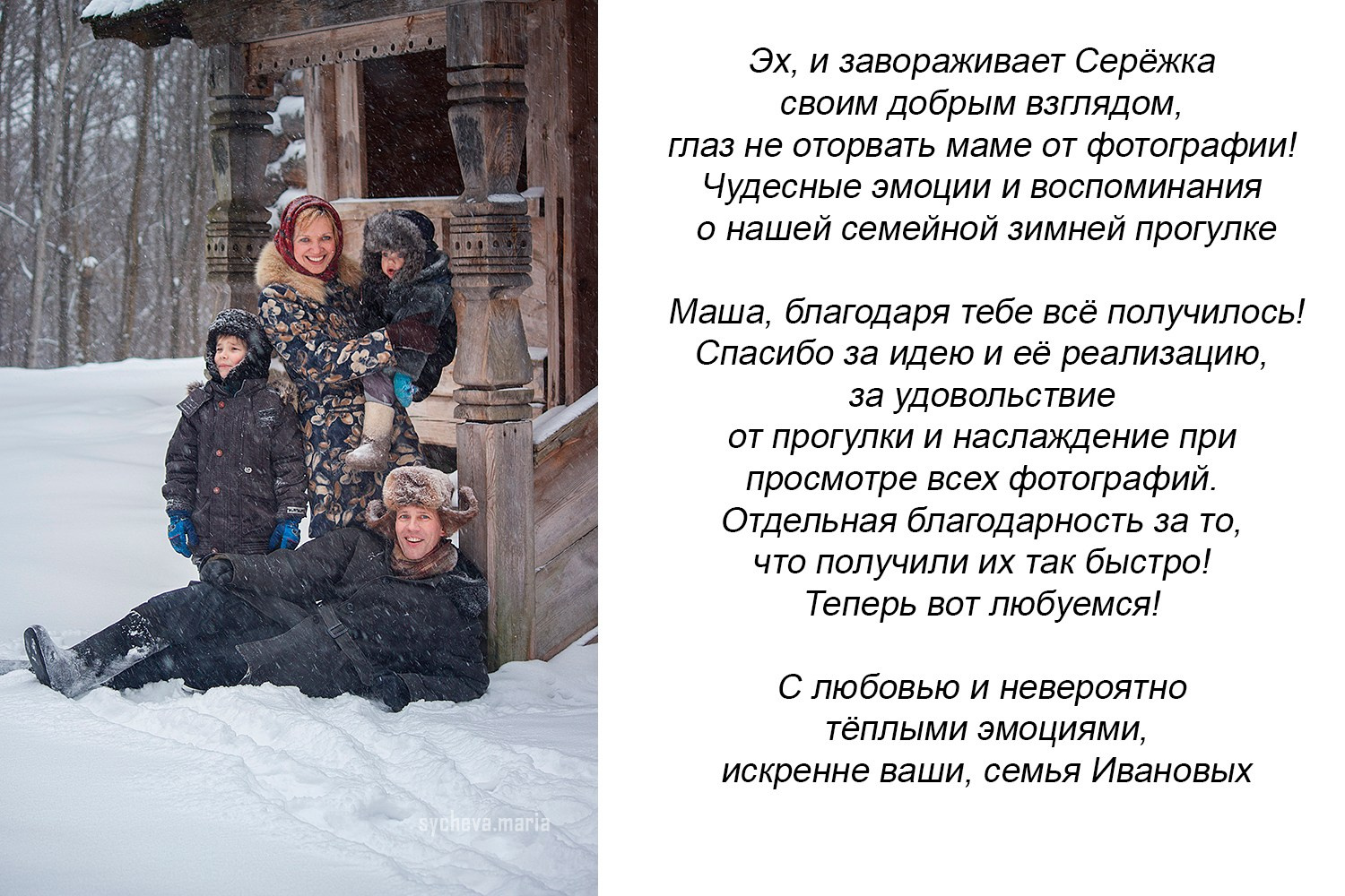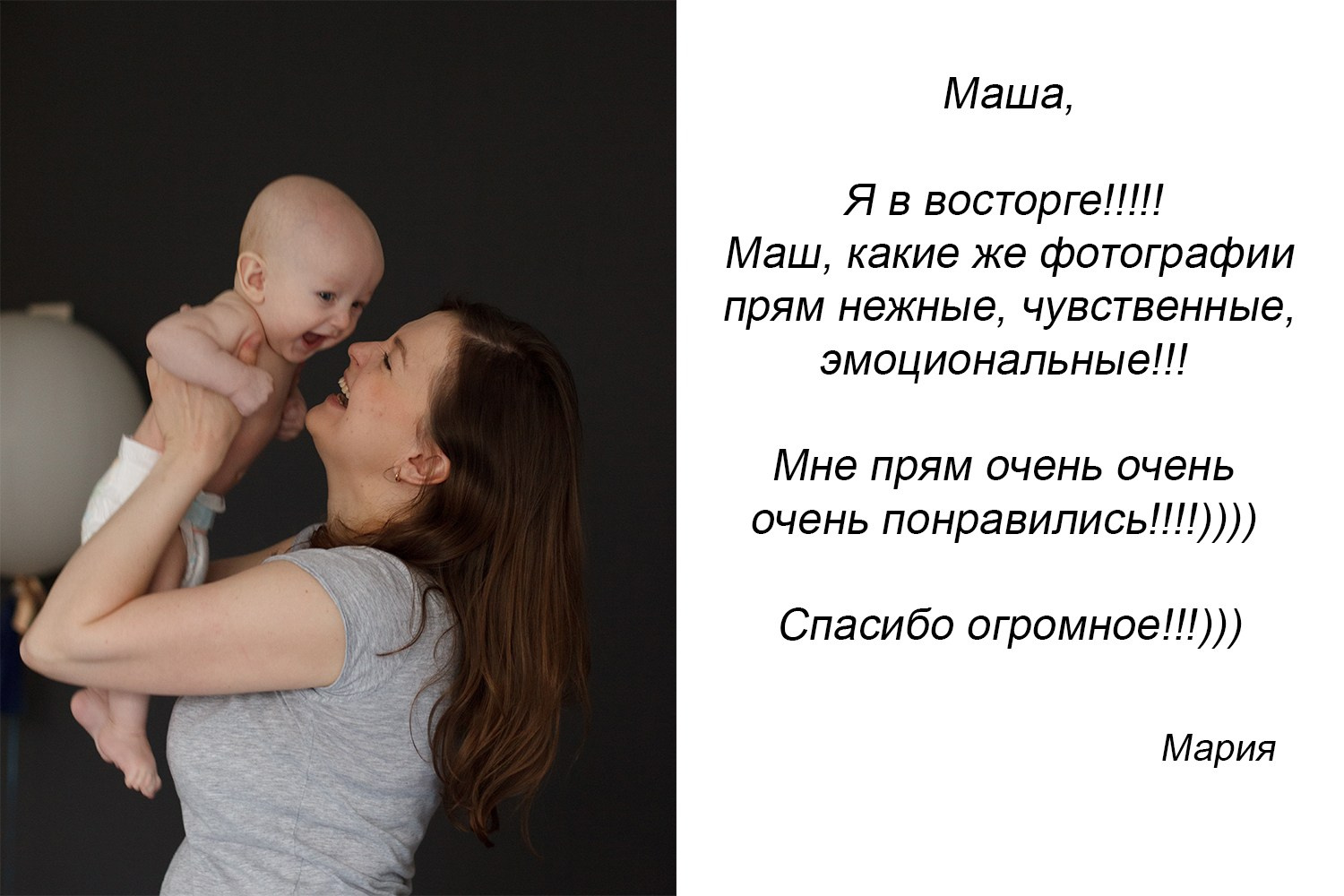Привет, я Мария — фотограф из Нижнего Новгорода. Создаю атмосферные фотоистории. С 2008 года снимаю детей, семьи и репортажи. Эколог по образованию, педагог по профессии, фотограф по призванию. Фотографирую с душой, просто и красиво.